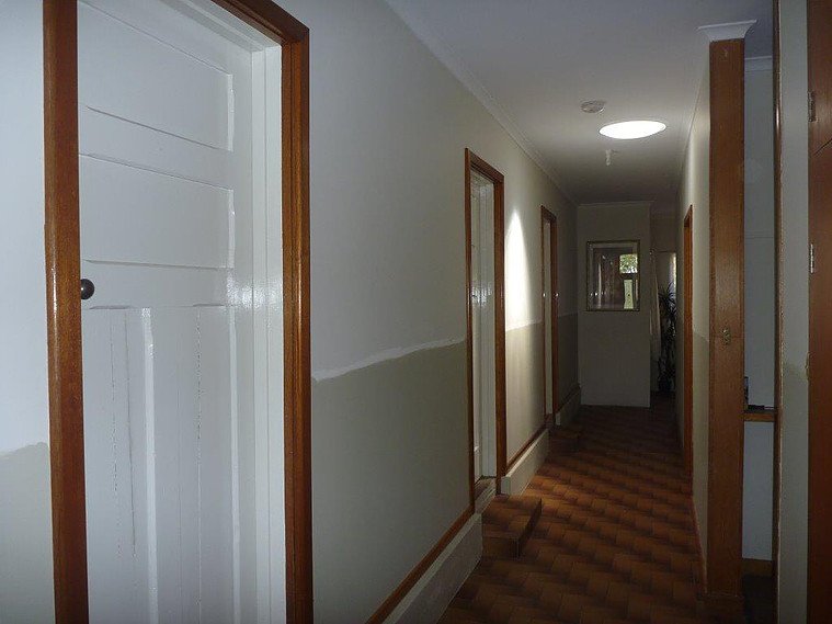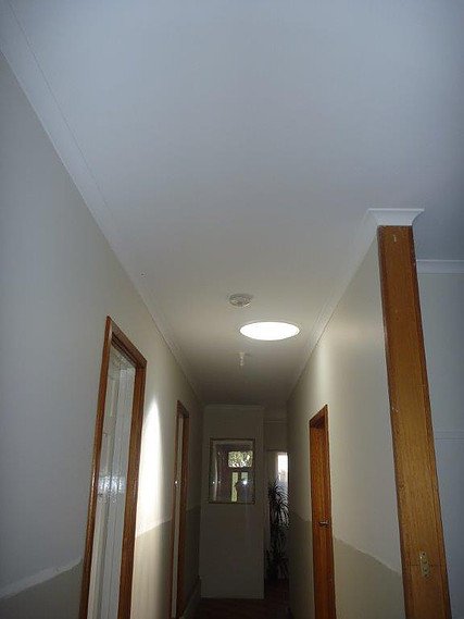 This area exhibited water damage to the hallway ceiling and walls. We undertook repairs to the box guttering prior to completing internal repairs. We then repaired the ceiling and gave the area a fresh feel by painting a 2 tone wall ready for the new frieze to arrive. We also improved the lighting in the hallway by installing a skylight.